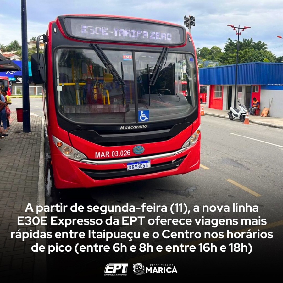 A partir da próxima segunda-feira, dia 11 de março, a Prefeitura de Maricá, por meio da Empresa Pública de Transportes (EPT), introduzirá em caráter experimental a linha E30E (Itaipuaçu x Centro). A iniciativa visa aprimorar a mobilidade urbana e reduzir significativamente o tempo de viagem entre os terminais de Itaipuaçu e do Centro da cidade, durante os horários de pico, das 6h às 8h e das 16h às 18h.
