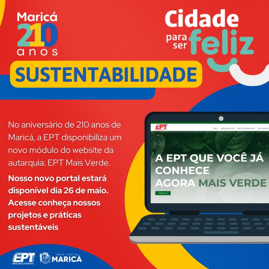 A Prefeitura de Maricá, através da Empresa Pública de Transportes (EPT), lançará no dia 26 de maio, em comemoração aos 210 anos da cidade, a versão sustentável do site da autarquia: "EPT Mais Verde". Este novo portal permite a consulta de iniciativas e projetos de sustentabilidade da EPT e permitirá que os usuários possam conhecer as práticas sustentáveis da autarquia e os projetos ecológicos em desenvolvimento.