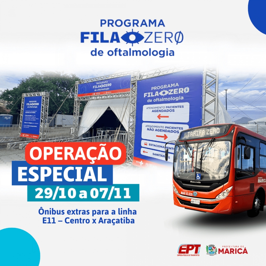 A Prefeitura de Maricá, por meio da Empresa Pública de Transportes (EPT), iniciará uma operação especial para atender à demanda extra de transporte público durante o programa “Fila Zero” de oftalmologia. De 29/10 a 07/11, ônibus extras estarão disponíveis na linha E11 – Centro x Araçatiba, com intervalos reduzidos e operação ajustada conforme o fluxo de pacientes, das 8h às 18h, incluindo finais de semana.